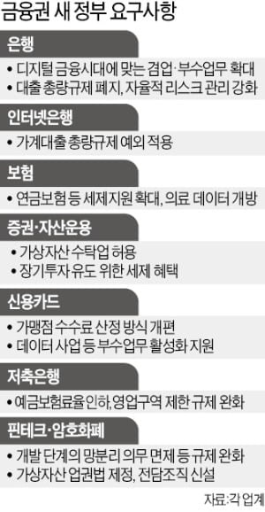 은행계에서 각종 규제 철폐 요구사항이 나오고 있습니다. 대표적으로 크립토커런시 전면 허용, 대출 총량 예외, 방카슈랑스 완화 등이 있습니다.