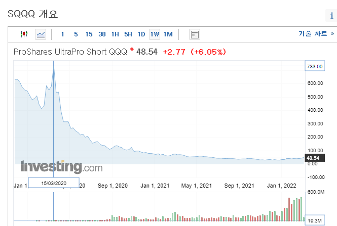 당시 한은은 증권사들의 연쇄부도를 막기 위해 IMF 금융위기때도 하지 않았던 무제한 RP(환매조건부채권, RePurchase agreements) 매입을 실시하며 겨우겨우 틀어막습니다. 그 때 나스닥 인버스를 추종하는 3배 레버리지 ETF인 SQQQ는 순식간에 주당 733$를 기록하기도 했습니다. 지금 우크라이나-러시아 전쟁으로 인한 오일쇼크에 준하는 유가 상승, 인플레이션을 막기 위한 테이퍼링 발동 등 각종 악재에도 불구하고 40$정도인걸 생각해보면 정말 나스닥은 나락으로 가 있던 상황이었습니다. 지금은 상상조차 할 수 없던 상황이죠.