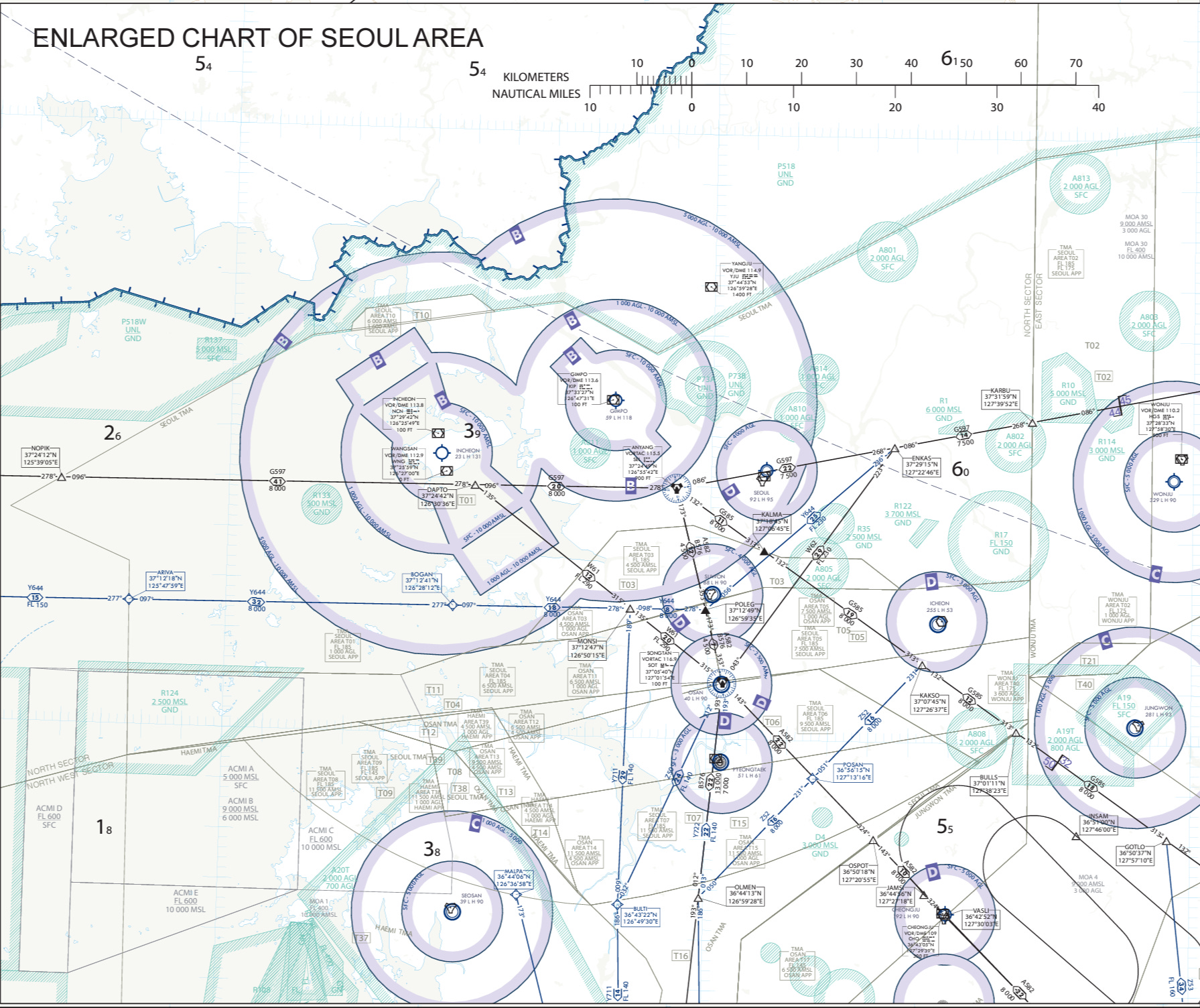 “NEW”P-73 바로 밑으로 G585 항로가 지나간다. G585는 서울방면으로 들어오는 West-bound 일방통행 항로다. 여기를 막으면 김포공항은 물론이요 인천공항까지도 지장이 생기게 된다. 어? 지장이 안생길거 같다고? 아직 우리가 빼먹은 존재가 있다. R-75이전을 상정 안했기 때문이다!!