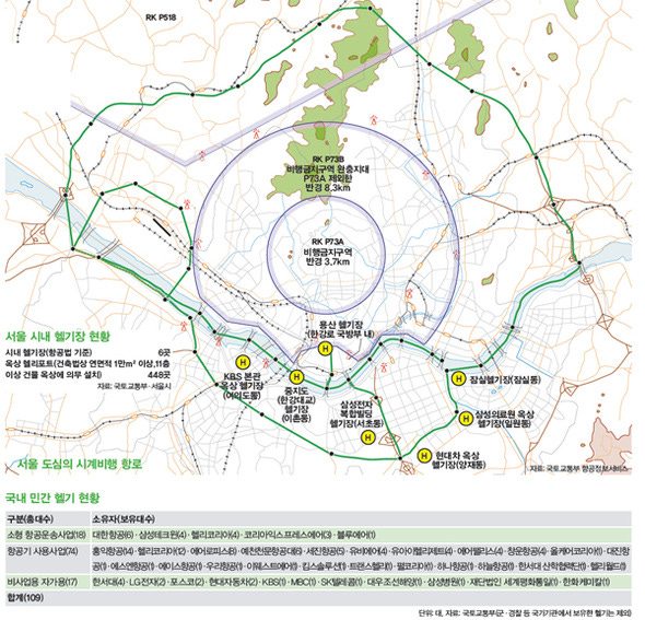 서울 시내 옥상 헬리포트는 448곳이고, 항공법으로 인정된 헬기장은 6곳이 있다. 이중에서 국방부 헬기장은 넘어가고, 중지도 헬기장과 KBS옥상헬기장, 삼성전자 헬기장이 P-73안에 들어가게 되버린다. 사실상 사용 불가가 되버리는거나 마찬가지다! 서울 시내 옥상 헬리포트중 사용 가능한 곳은 몇 군데나 될까? 그리 많지 않을것이다.